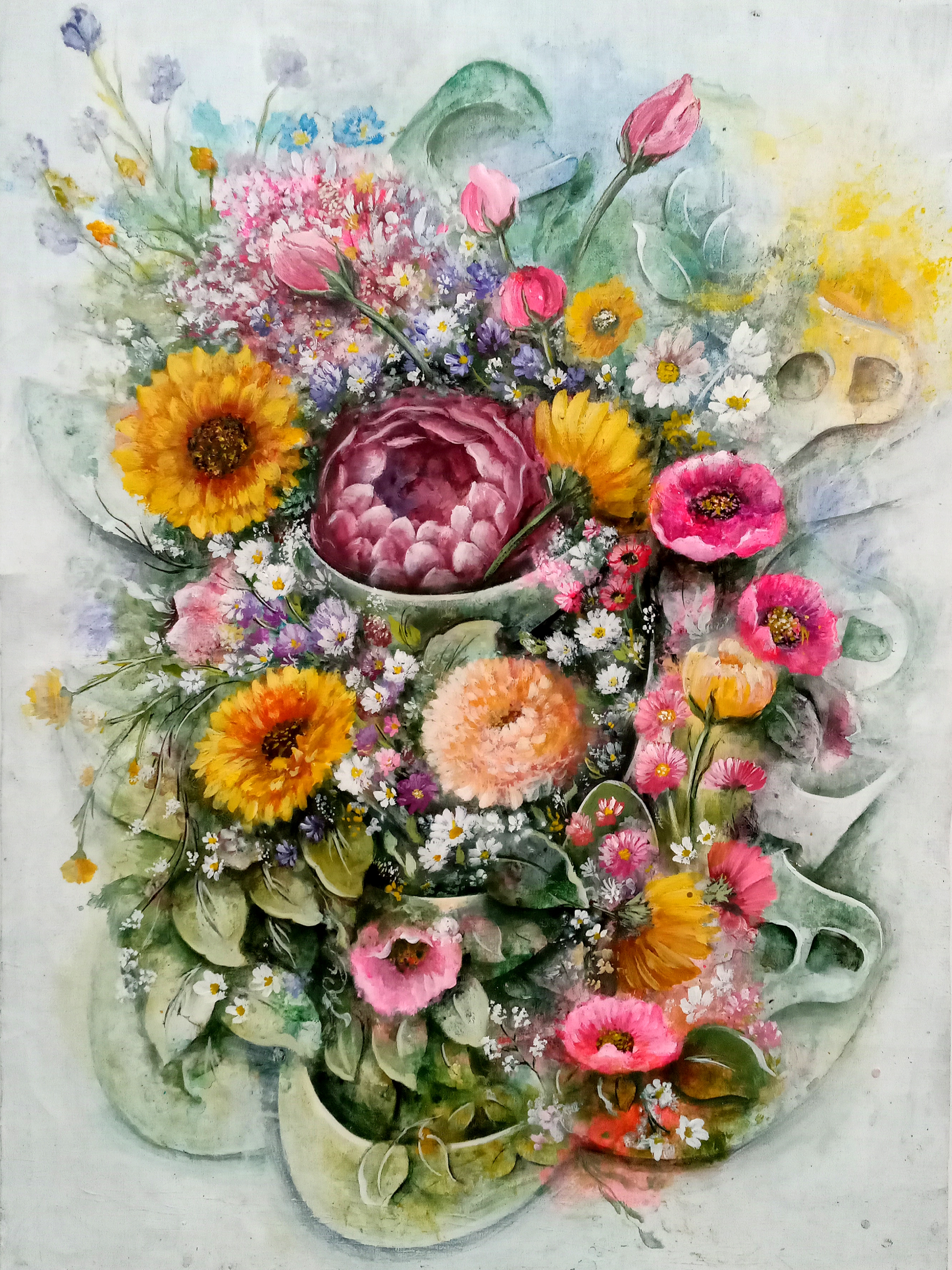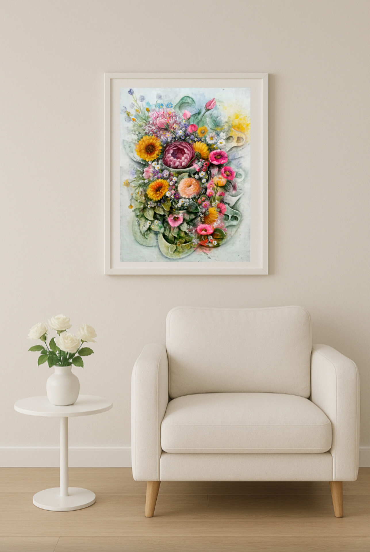 این تابلو دکوراتیو ترکیبی از گل و رنگ و نقاشیخط است که با استفاده از رنگ اکریلیک اجرا شده است و میتواند فضایی خاص به دکوراسیون شما ببخشد.